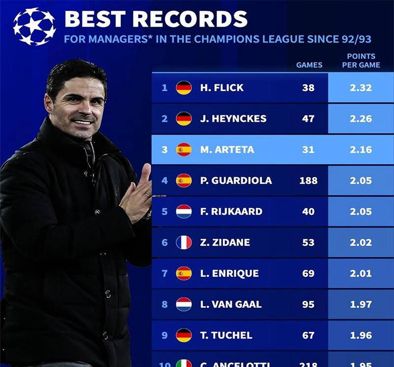 阿尔特塔欧冠场均得分力压瓜迪奥拉,三甲荣誉却缺少冠军徽章